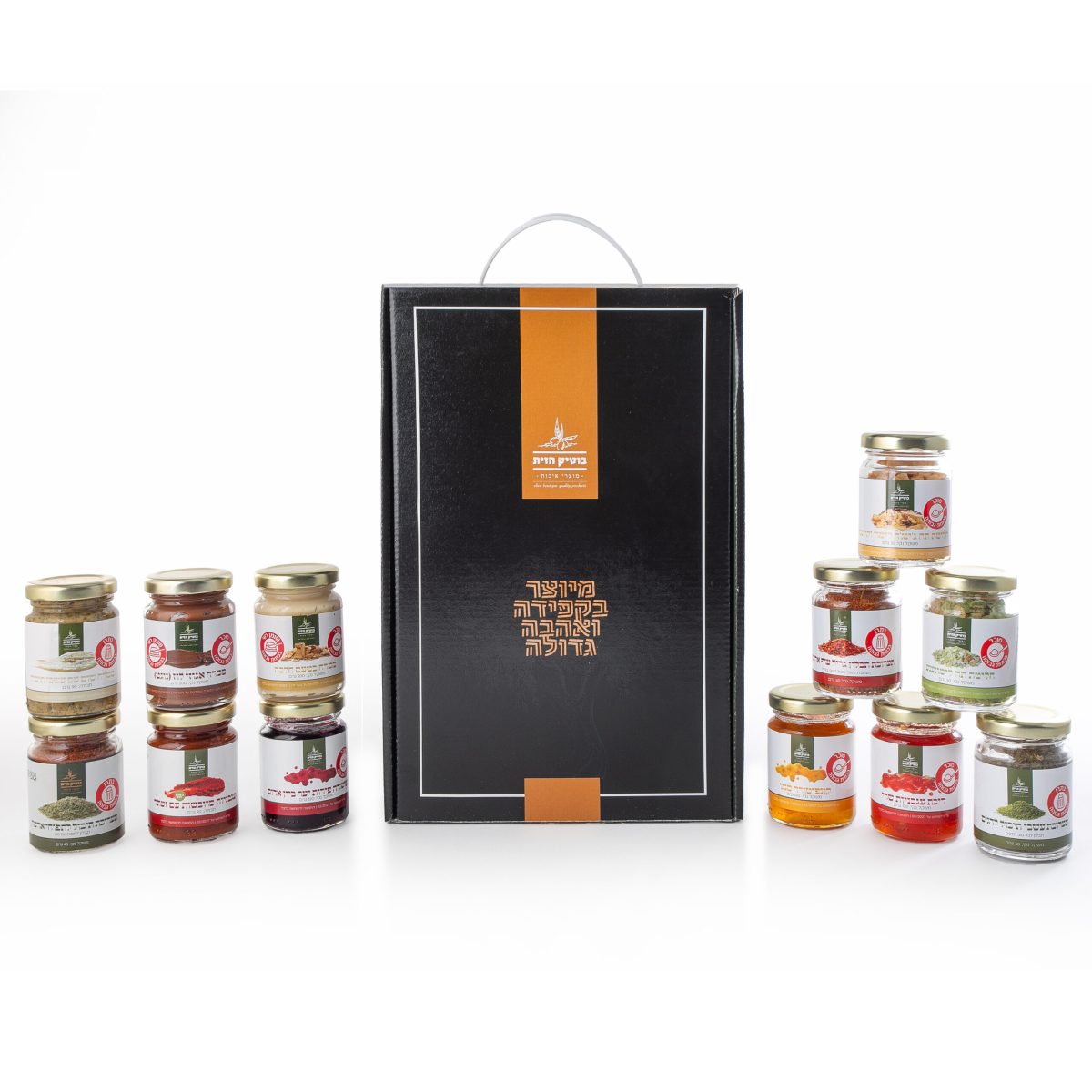 פירות יער ביין אדום, עגבניות שרי,מנגו 3 תערובת תבלין: עשבי תיבול לדגים, גריל עוף ארומטח, תיבול לתפו”א 2 ממרח מלוח: שום עם עשבי תיבול, עגבניות מיובשות עם זעתר 2 ממרח מתוק: אגוז לוז נוגט,חלבה |